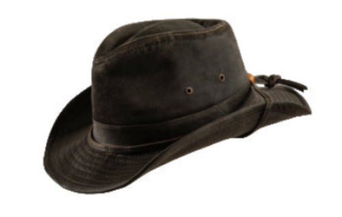 For adventurers everywhere, the Rustic Outback is a stylish statement with its distressed finish. Made of a lightweight polyester/cotton blend, the Rustic Outback keeps you cool and in the summer and is water resistant. The brim features a memory wire so you can shape it to your liking, and a unique concentric sewing pattern. The Rustic Outback also has a handy chinstrap for breezy days.